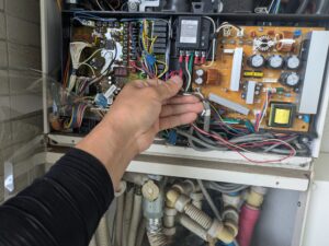 まずは給湯器本体に接続している洗濯注水ユニットの電源とリモコン配線を外します。