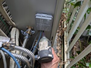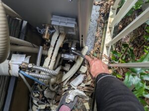 各配管の水漏れとガス漏れ検知器でガス漏れの確認します。