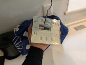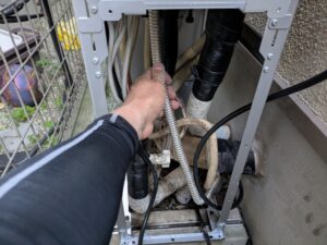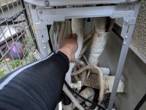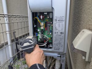 コンセントやリモコン、各配管を外して給湯器本体を撤去します。