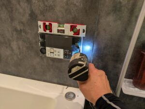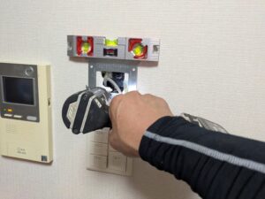 浴室リモコンの水平を確認しながらビス止めします。