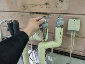 各配管の水漏れとガス漏れ検知器でガス漏れの確認します。
