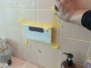 浴室リモコンのまわりをマスキングテープで養生します。