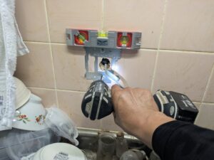 浴室リモコンの水平を確認しながらビス止めします。