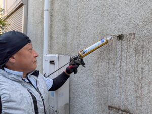 既存ビス穴に防水のコーキング処理をします。