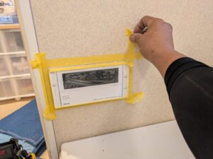 浴室リモコンのまわりをマスキングテープで養生します。