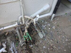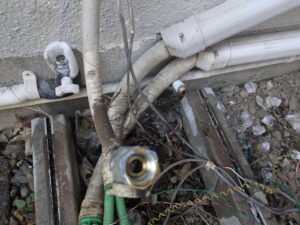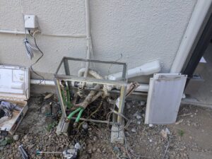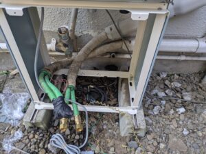 コンセントやリモコン線を抜いて各配管を外し給湯器本体を撤去します。