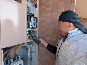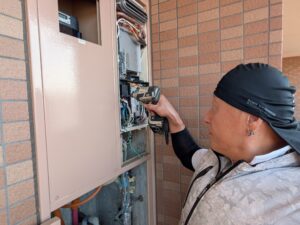 止水栓を開けて水漏れ・ガス検知器を使用してガス漏れ確認を行います。