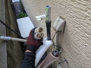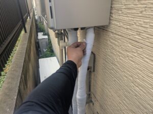 各配管に保温材を取り付けてキャンパステープを巻きます。