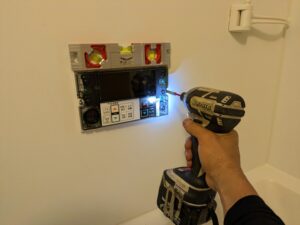 浴室リモコンの水平を確認しながらビス止めします。