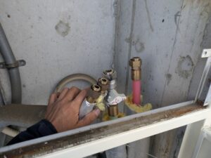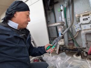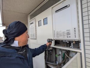 止水栓を開けて水漏れ・ガス検知器を使用してガス漏れ確認を行います。
