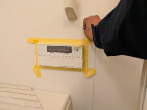 浴室リモコンのまわりをマスキングテープで養生します。