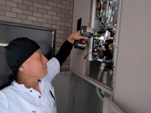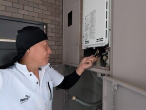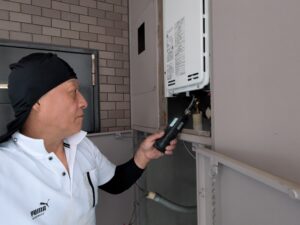 止水栓を開けて水漏れ・ガス検知器を使用してガス漏れ確認を行います。