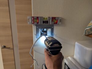 浴室リモコンの水平を確認しなからビス止めします。