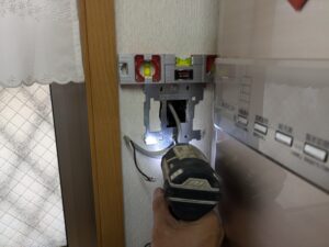 浴室リモコンの水平を確認しなからビス止めします。