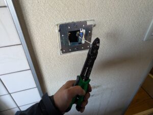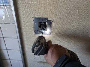 新しい台所リモコンの取付金具を水平にビス止めします。